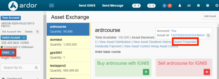 | 2. Select the Ignis chain, click on Assets under "Dashboard" in the left sidebar and click on the "Asset Properties" link as shown in the following figure: |