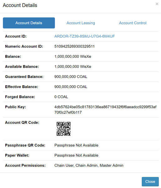 Account Details modal dialog with permissions specified for a given chain