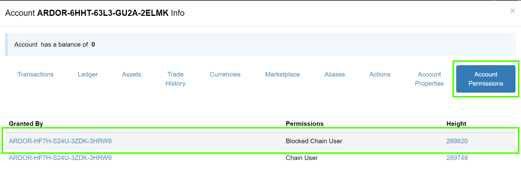 Account permissions of the blocked user. Highlighted.